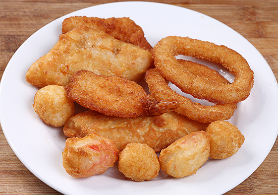 種類:天婦羅魚片、天婦羅蟹塊、裹粉魷魚圈、裹粉蝴蝶蝦、裹粉扇貝